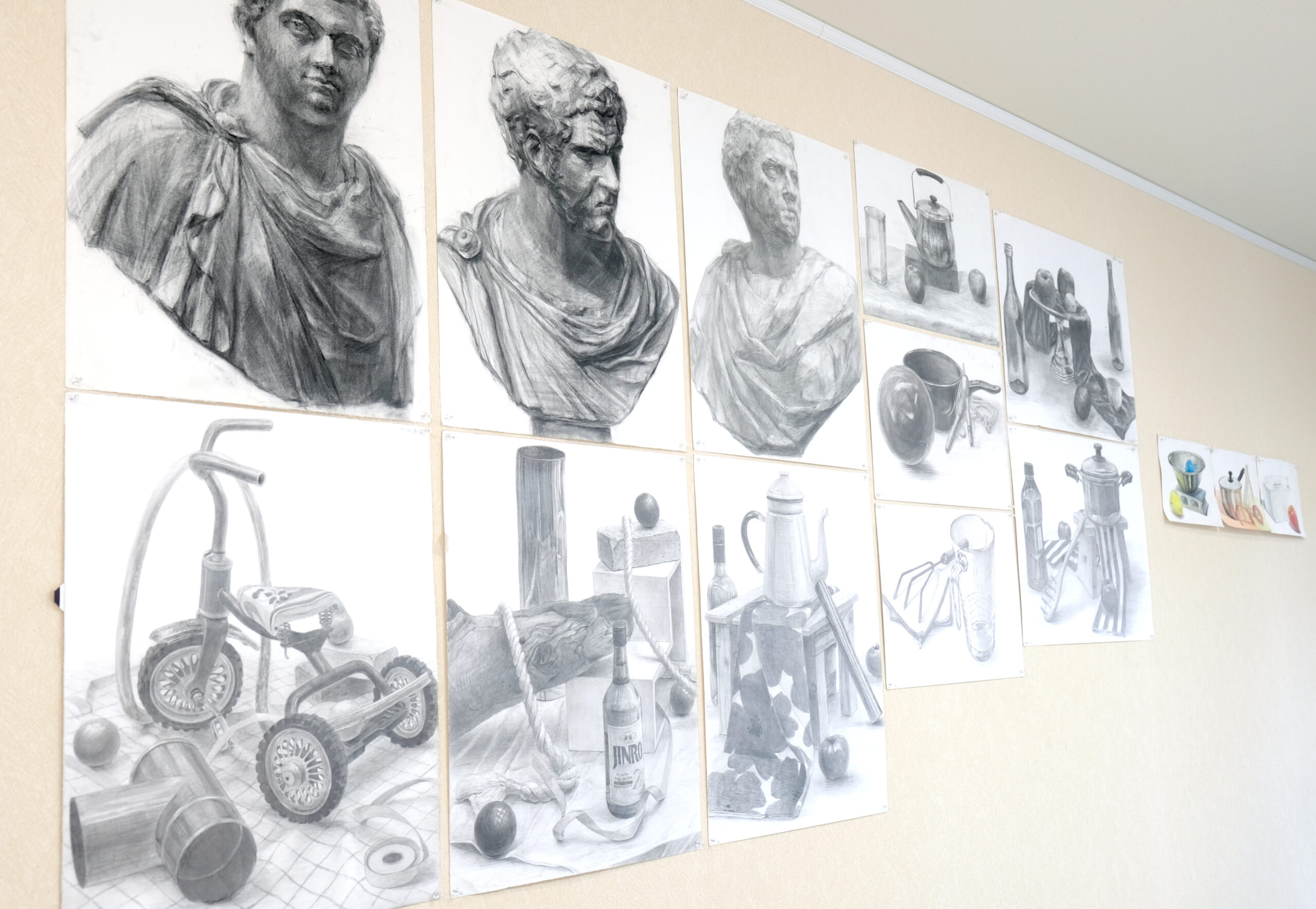 取手松陽高校美術科・笠間高校美術科の合格を目指す中学生と、美大芸大を目指す高校生を対象とした実技対策クラスです。受験で求められる技術を基礎から身につけ、試験本番で実力を発揮できる力を育てます。基礎的な力を習得したのち、本番形式 ( 実技 3 時間 )+講評・振り返りで進行します。講評・振り返りの時間を丁寧に設けることで、課題点を明確にし、効率よく力を伸ばしていきます。